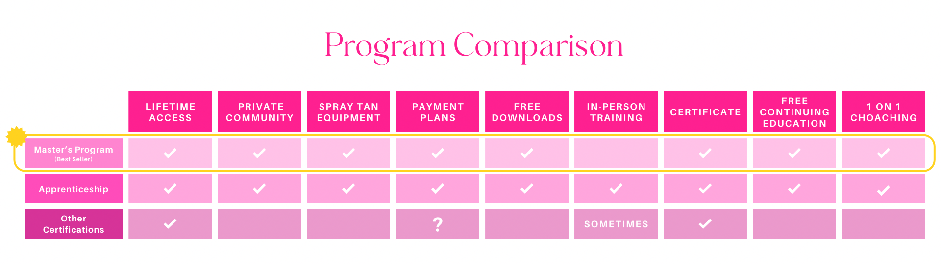 - Membership into a thriving sorority of ambitious spray tanning pros to network and troubleshoot with.
